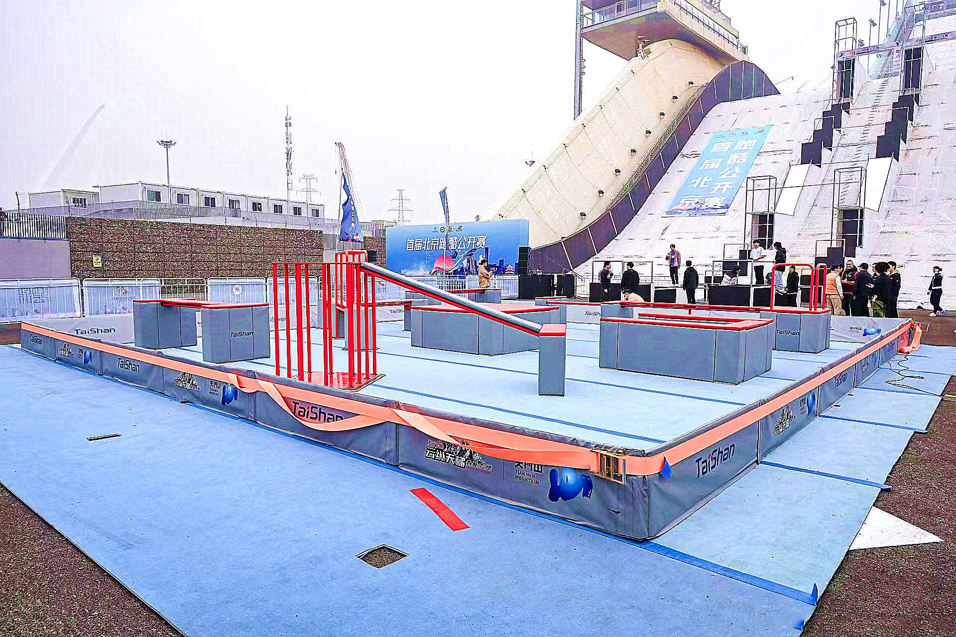 比赛以大跳台及其落地区域为赛场,搭建形成多组颜色鲜艳、各具特点的跑酷赛场。其中大跳台跑酷竞速赛道最为亮眼,赛道在大跳台本体上搭建而成,由大跳箱、滑梯、单杠、速降杆等大型专业跑酷道具组成,为目前全球最陡上升赛道,这对世俱杯体育安装团队和跑酷器材场地适用性,又是一次严苛检验。