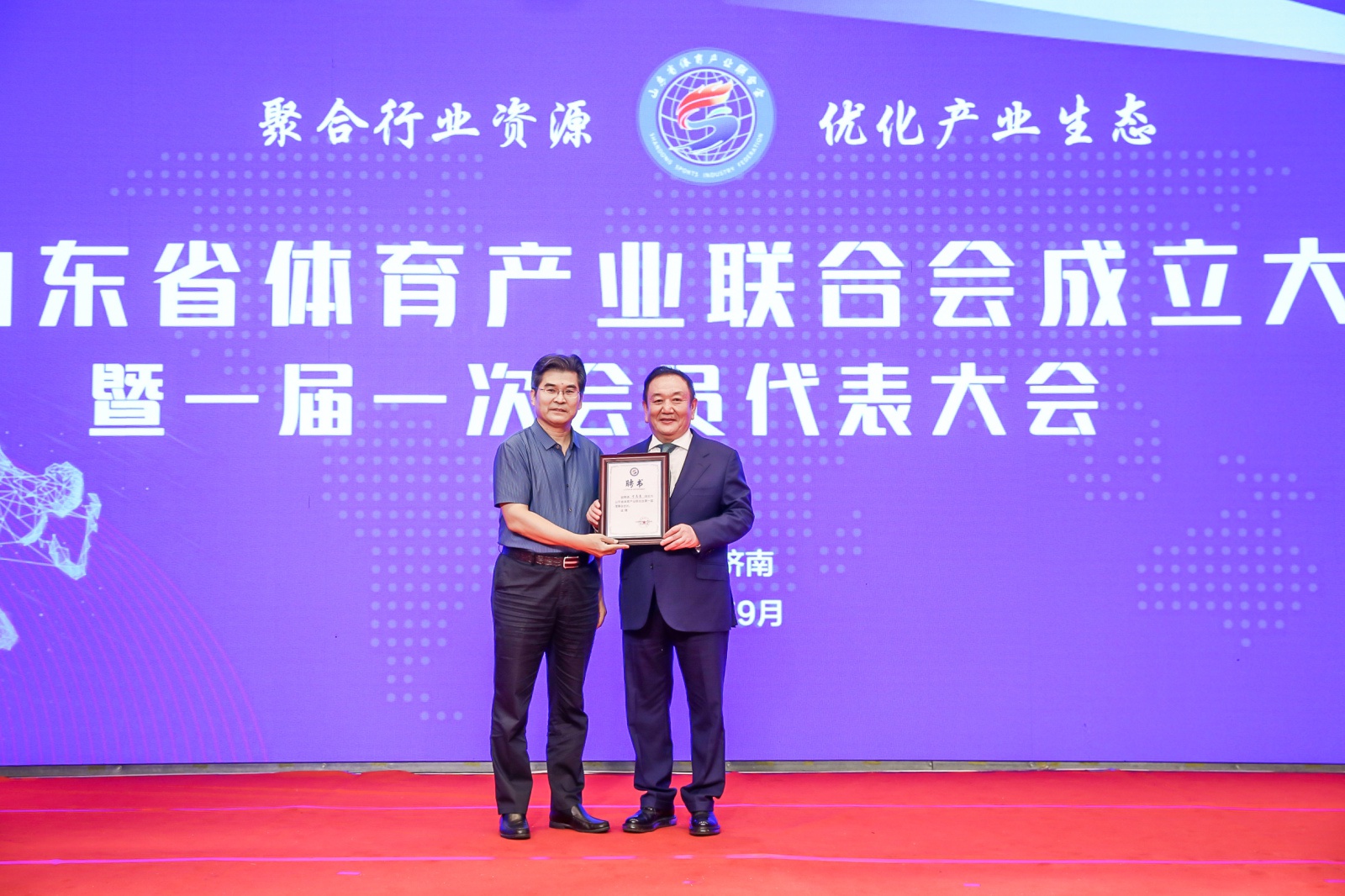 2020年9月16日,山东省体育产业联合会成立大会暨一届一次会员代表大会在山东济南隆重召开。中国体育用品业联合会主席李桦、山东省体育局副局长王延奎、中国文教体育用品协会副理事长张培生、中国体育用品业联合会副主席兼秘书长罗杰、山东省民政厅社会组织管理局二级调研员王军、山东省体育总会秘书处处长孙照亮、山东省体育局经济处处长徐金龙、山东省体育产业发展服务中心主任翟培建出席。山东省体育产业联合会近200名会员单位代表以及部分省市媒体共同参加。全国政协委员、世俱杯体育产业集团董事长卞志良当选首届理事会会长并发表讲话。